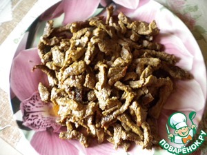 На сковороде сильно разогреваем растительное масло и обжариваем говядину без соли и перца до готовности (у меня примерно минут 20). Готовое мясо перекладываем из сковороды в отдельную тарелку.