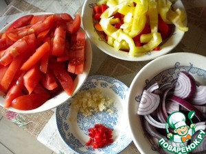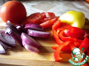 Овощи режем крупно. Лук - полукольцами. Болгарский перец (у меня был один красный и один желтый) - дольками, помидоры - длинными брусочками. Размер (по ширине) нарезки овощей должен быть соизмерим с шириной полоски мяса (т. е. около 1 см).