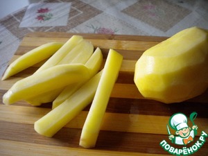 Параллельно приготовлению мяса и овощей занимаемся картошкой. Картошку (два крупных клубня) нарезаем как для фри и жарим на отдельной сковороде до готовности.