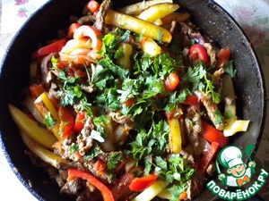 Когда овощи стали мягкими, добавляем к ним жареное мясо. Солим, перчим, добавляем полстакана белого сухого вина, 1-2 ст. ложки сока лимона или лайма, 1 ч. л. орегано. Тушим минут 5-10, пока вино не выпарится.