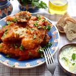 Готовим негустой томатный соус: 5 крупных помидоров чистим от кожицы, в блендере измельчаем помидоры, петрушку (по вкусу). Обжариваем до золотистого цвета 1 среднюю луковицу (мелко измельченную), добавляем томатную смесь и воду (количество воды по вашему вкусу, соус не должен быть слишком густым - главное, чтобы он покрывал кофту, и чтобы было достаточно жидкости для полного приготовления риса), доводим до кипения, добавляем по вкусу черный перец и соль (не солите слишком сильно, мы уже добавляли соль в кофту), убавляем огонь до минимума и кладем в томатный соус подготовленную, слегка обжаренную кофту (хотя обжаривать не обязательно, это по рецепту). Тушим 10 минут.