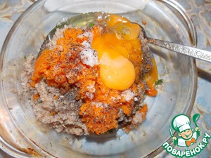 Затем соединить все ингредиенты, посолить и поперчить.. добавить яйца.