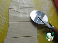 Слоеное тесто порезать полосками и раскатать тоненько (без фанатизма!). Каждую ленточку порезать прямоугольниками. |