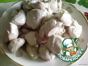Куриное филе помыть, очистить от пленочек, обсушить, нарезать небольшими кусочками и слегка обжарить.
