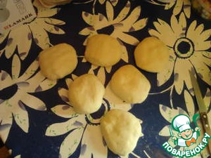 Замесить довольно крутое тесто из муки и воды, положить в пакет на расстойку на 20 мин., затем разделить на 3 части (у меня на фото двойная порция, поэтому кусочков 6)