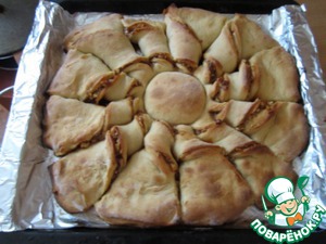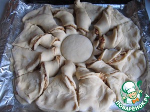 10. Из второй части теста раскатать такую же лепешку и положить ее на первую с начинкой. -
