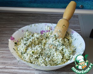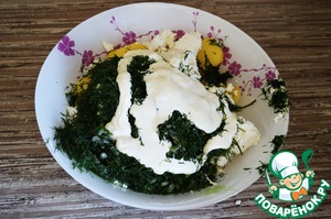 Добавить творог, зелень, сметану. Посолить.
