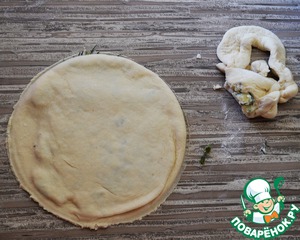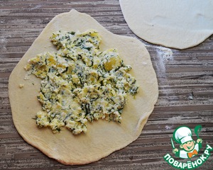 • Я леплю так. Посыпаю стол мукой. Из двух шариков раскатываю кружки. На один кладу начинку. Другим накрываю.