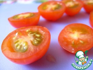 Черри вымыть, обсушить и разрезать на половинки.