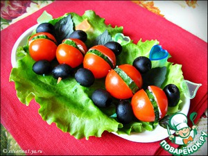 Собрать черри с огурцом, как показано на фото: половинка черри, кружочек огурца, снова половинка черри.