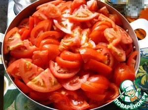 Последний слой – помидоры, нарезанные на кружочки или более мелкие кусочки.