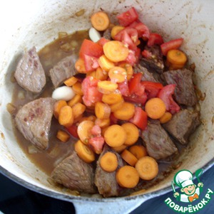 Добавить морковь (800 гр), нарезанную кружочками, помидоры (2 шт), нарезанные мелкими кубиками, 2 зубчика чеснока, разрезанные пополам. Добавить бульон (1 л), соль, перец. Довести до кипения, накрыть крышкой и тушить на маленьком огне 2,5-3 часа.