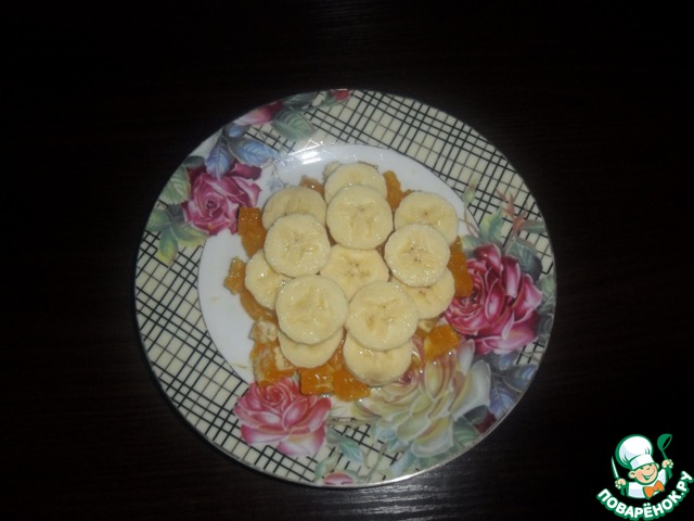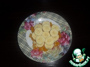 Банан нарезать кружочками и выложить вторым слоем на апельсины.