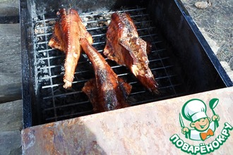 Семгу без шкурки нарезать порционно на узкие, длинные полосочки, толщина 1-2 см, посолить, добавить специи по вкусу.