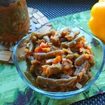 Этот салат готовлю несколько лет. Как заготовку, но годится и для употребления сразу, не надо стерилизовать. Прижился он у нас, что немаловажно для меня, ведь муж только в таком виде кушает стручковую фасоль. Делаю сразу двойную порцию.