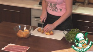 • Персики помыть, разрезать пополам и пожарить на сковородке с одной стороны минуты три, затем горячие выкласть в миску и затянуть пластиком, что бы запарить. Когда остынут -очистить от кожуры.