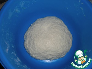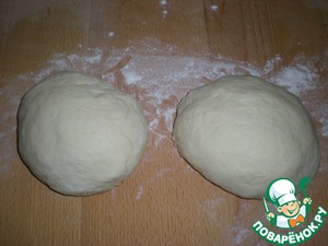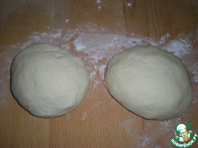 • Тесто к тому времени подошло. Нужно достать из миски и разделить его на две части.