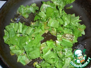 • Щавель крупно порезать. Столовую ложку сливочного масла растопить на сковороде и положить в него щавель. Всыпьте в зелень пол чайной ложки сахара, чтобы убрать лишнюю кислоту. Тушить нужно буквально пару минут, чтобы щавель поменял свой цвет – стал темно зеленым. Остудите зелень.