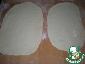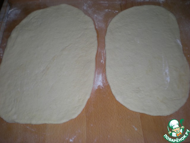• На посыпанной мукой доске раскатать два прямоугольника (ну, насколько это возможно...). Один побольше, второй – чуть меньше. Толщина теста должна быть приблизительно 5-7 мм.