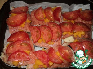 Помидор нарезаем полукольцами (можно кружками) и кладём сверху тыквы.