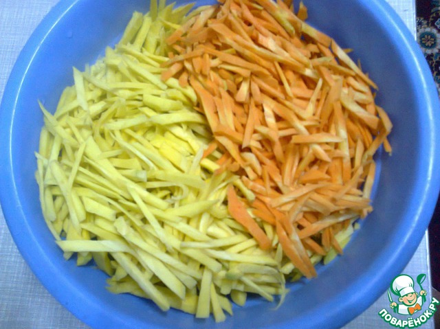 Морковь очистить и нарезать соломкой, как на картинке, я взяла по полкило красной и жёлтой моркови, так красивее.