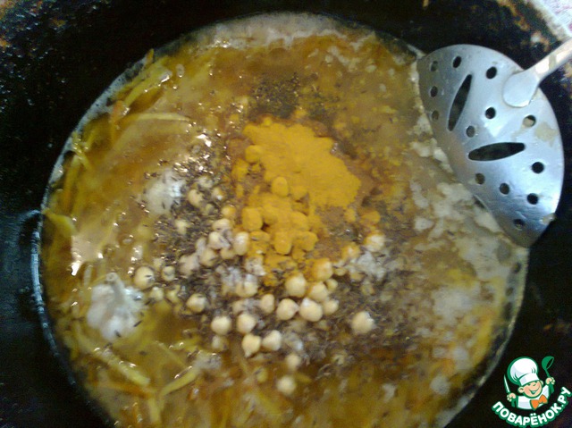 Если готовите плов вечером, то утром нужно замочить нут в тёплой воде с добавлением 2 ч. л. пищевой соды.
