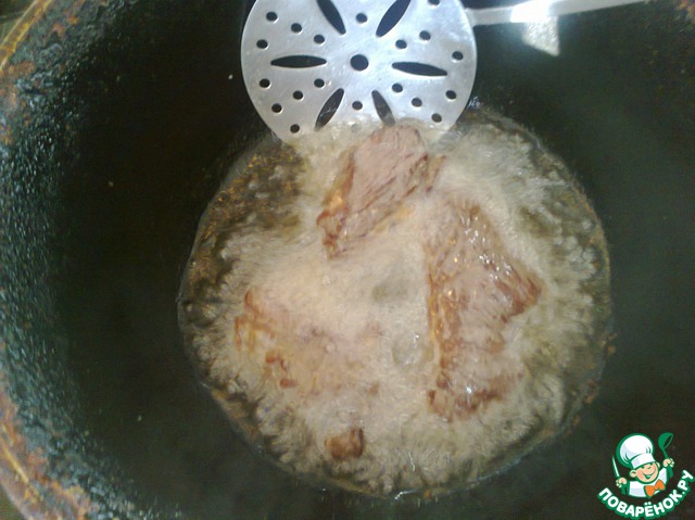 Сделать большой огонь! В большом казане раскалить масло, бросить туда 1 чайную ложку соли и в кипящее масло положить мясо, нарезанное большими кусками. Как только с одной стороны появится корочка, перевернуть и обжарить с другой стороны.
