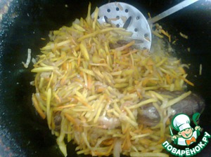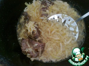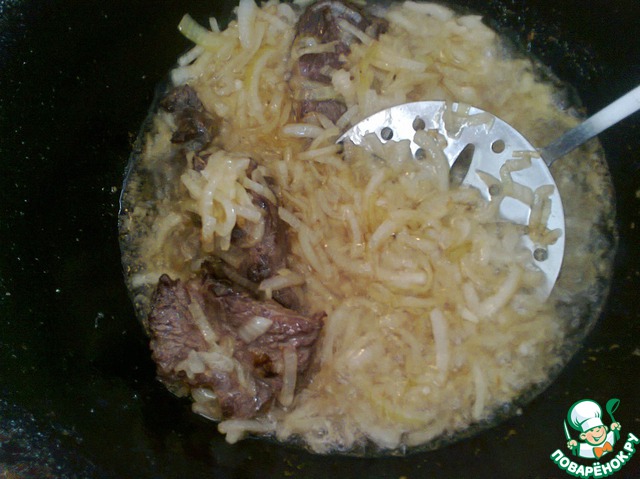 Затем положить лук и, помешивая иногда, зажарить лук до золотистости, но не пережаривать.