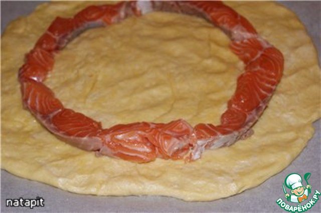 Отступить от края 3.5 см и по кругу выстелить нарезанные 2.5 см толщиной полоски лосося. -
