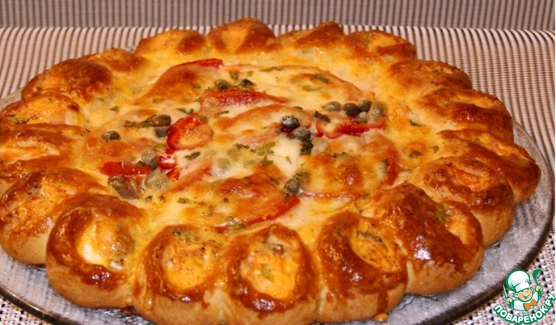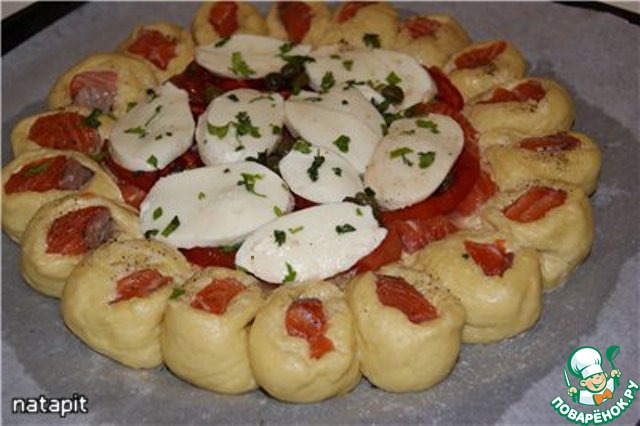 Равномерно распределить каперсы и накрыть всё кружочками моцареллы.