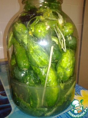 Уложили красиво или нет - ваше право. Я уже давно не закрываю огурцы в 3-х литровки, так что в моем случае эта емкость - промежуточный этап. И заливаем соляным раствором. На трехлитровую банку у меня ушло 1.5 килограмма огурцов и 1.3 литра соленого раствора.
