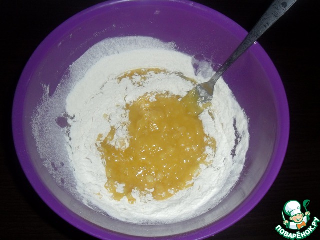 Муку соединить с разрыхлителем, перемешать и высыпать в желтки с маслом.