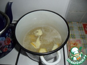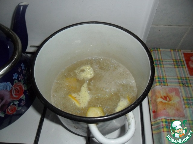 Теперь начинка: 400 мл воды поставить на огонь, добавить сок целого лимона и лимонную шкурку, срезанную ножом и сахар. Довести до кипения и варить пару минут. Шкурку достать.
