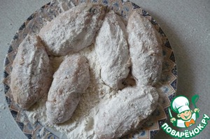 В плоскую тарелку кладем муку и формуем там 6 котлет, продолговатой формы. Хорошенько обваливаем в муке.