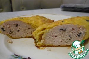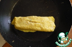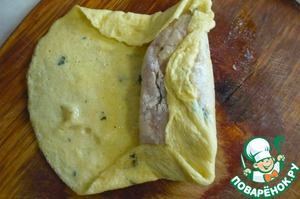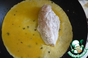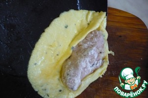 Сковороду нагреть, смазать маслом и налить часть яичной смеси. И сразу кладем котлету чуть ближе к краю.