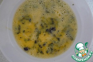 Яйца соединить с 2 ст. л. масла, с 2 ст. л. воды и резаным базиликом. Хорошо перемешать, но не взбивать. Оставить настаиваться 10 мин.