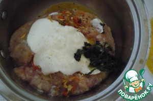 Пока яичная масса впитывает в себя аромат базилика, мы делаем фарш. В куриный фарш добавляем специи, соль, воду, сметану, перемешиваем. Через 10 мин. вылавливаем базилик и добавляем его в фарш. Теперь хорошенько перемешать и отбить. Т. е. порцию фарша поднять над миской и кинуть обратно. И так 2-3 мин.