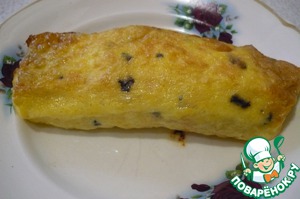 Как только яйцо схватилось, мы снимаем сковородку с огня и, помогая себе лопаткой, выкладываем содержимое на любую поверхность (у меня разделочная доска).