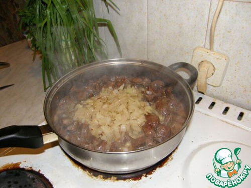 Минут через 10 обжарки добавляем пассерованный предварительно лук и, перемешав, оставляем еще минут на десять.