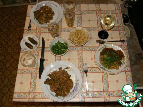 Украшаем зеленью готовое блюдо, наливаем вина или водки и...
