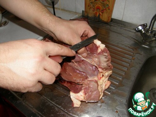 Сердце чистим от жил, жира и сосудов и режем кусочками примерно по сантиметру.