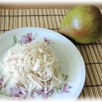 Очистить грушу и натереть её на крупной тёрке прямо в салатник с капустой, чтобы сохранить сок.