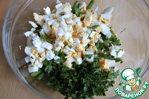 Отваренные яйца нарезать кубиками. Зелень петрушки (3-4 веточки) - измельчить. Добавить к фасоли.