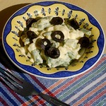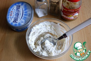 Заправка: смешать творожный сыр, горчицу, приправить солью и перцем по вкусу.
