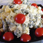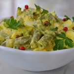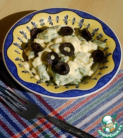 Этот салат хорош тем, что он пригодится и жарким летом, вместо ужина, и холодной зимой, как закусочный. Пикантная заправка из творожного сыра и горчицы придадут простым ингредиентам неповторимый вкус. Дополнения - по вкусу и предпочтениям.
