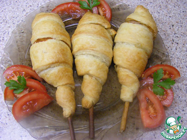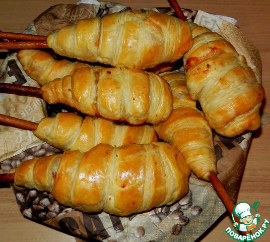 Берем соломку с фаршем и от середины оборачиваем тестом.