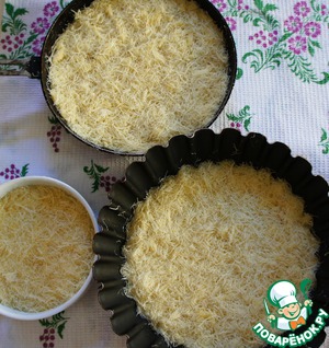 На формы по 17 см в диаметре у меня ушло по 190 гр кунафы, на маленькую форму (13 см в диаметре) ушло 120 гр кунафы. Если я беру форму 28 см в диаметре - у меня угодит около 300 гр кунафы. -