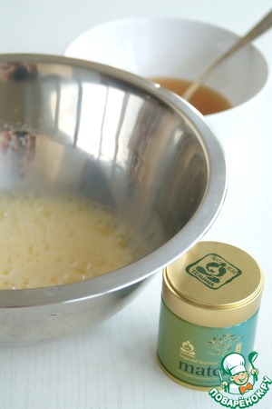 Взбить слегка яйца, добавить лимонный сок с сахаром и цедру. Добавить чай "матча". Хорошо все смешать. Смесь процедить через мелкое сито.