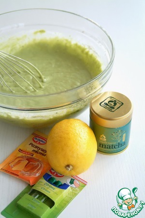 Добавить цедру и сок половины лимона, пудру чая "матча" (можно добавить любой натуральный краситель, например, шпинатный или свекольный сок).