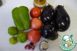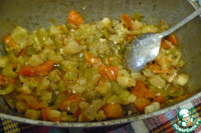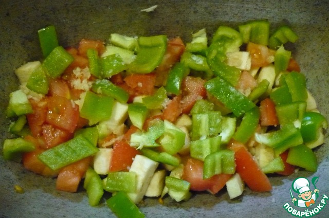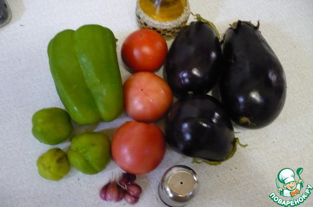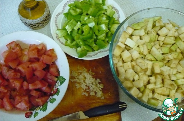 • Баклажаны почистить, нарезать и замочить в соленой воде на 15 мин. Нарезать помидоры и перец. Чеснок измельчить.